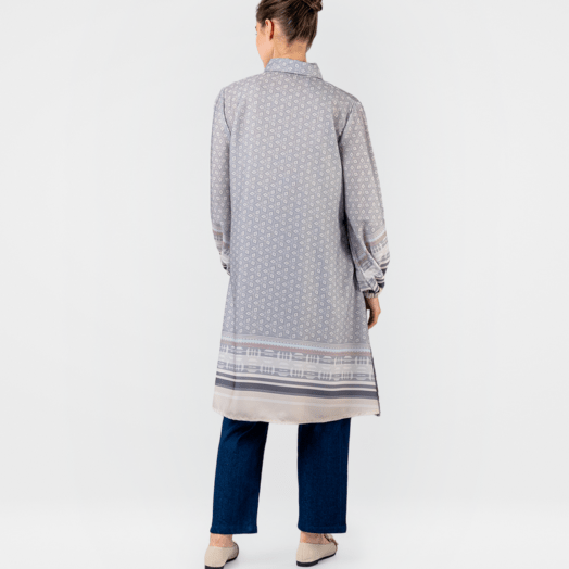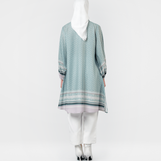Tunik Pattern 0559-3180 – Dirancang dengan model yang casual. Desain menggunakan motif abstrak pada seluruh bagian bahan. Tunik ini memiliki lengan panjang berbentuk balon. Pada bagian depan terdapat kancing dan dilengkapi dengan saku pada bagian samping. Bahan yang nyaman, cocok untuk digunakan sehari-hari. (Tinggi model pada foto : 171 cm)